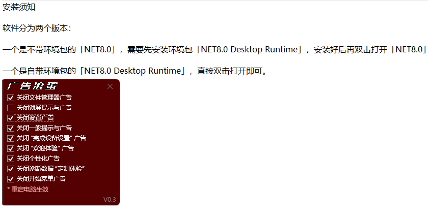 这款软件能清除系统广告,体积小但功能强大,适合追求干净系统的用户。若未更新至NET8.0,可选择带系统环境的版本,双击.exe即可使用。若选不带环境包的版本,需先安装NET8.0 Desktop Runtime,安装简单,双击后点击安装即可。安装后,双击OFGB启动软件,或直接双击OFGB-Deps运行。