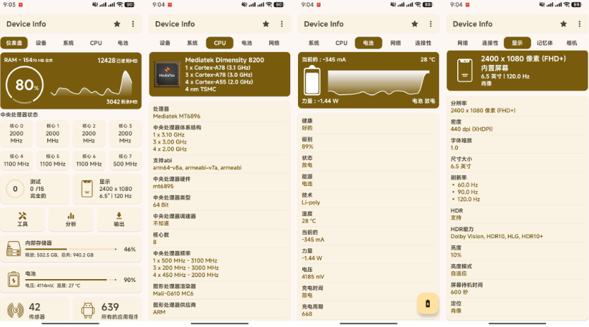 【软件介绍】:安卓设备信息是一款手机硬件和系统信息检测应用的安卓设备硬件检测工具,可以全面查看设备的各种详细状态。功能包括:硬件监测仪表盘,设备型号,CPU处理器,Android系统版本,电池,屏幕,网络,相机,传感器,热感器,应用程序,自动和单独测试各项硬件功能等。