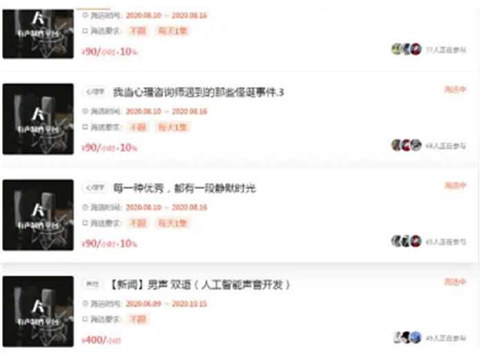 有声制作平台,是一个连接作家、出版社、主播以及音频制作人的资源撮合平台。在这里,大家将会一起创造优秀的有声作品,用声音为文字创造新价值。首先,作家或出版社会向平台提供有版权的内容,并以发布任务的形式寻找合适的主播进行录制。接着,主播会根据要求完成作品录制。最后,由后期制作人处理音频。