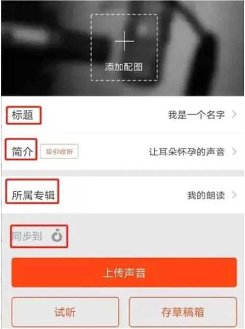 录好了的声音需要上传。选择一个专辑(新建),取好标题,写好简介上传就OK了。同步到动态最好是点亮,可以让更多人看到。