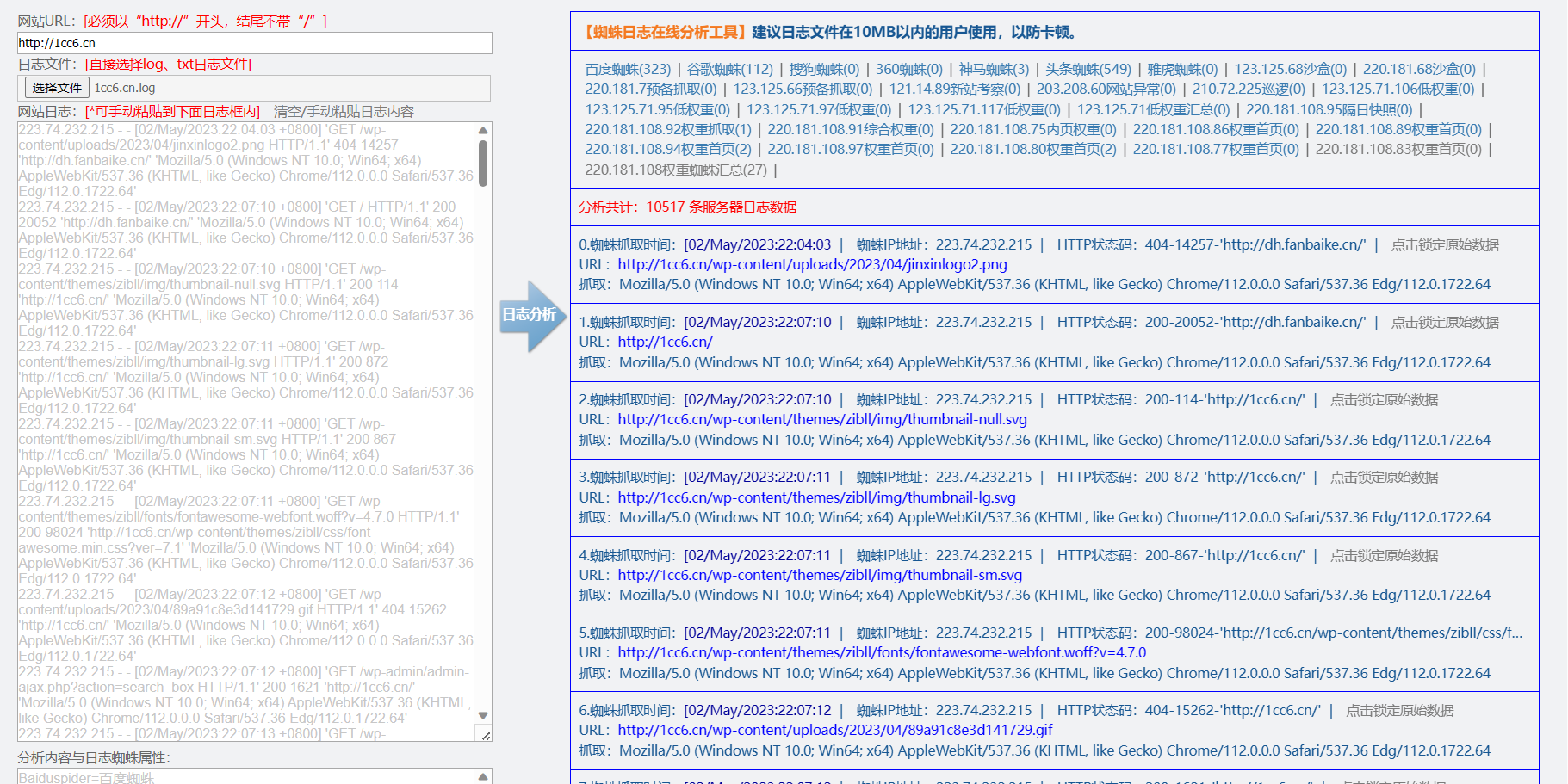 将网址日志全部內容拷贝到左边,随后点一下剖析按键,就能便捷的查询搜索引擎网络爬虫的抓取记录了。