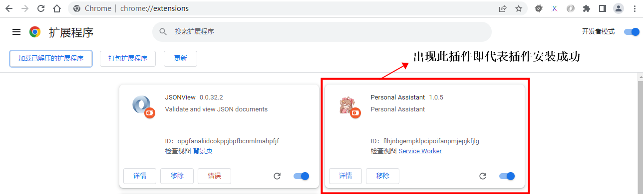 4. 将下载的插件解压后,进入子目录,拖入浏览器插件页面即可安装成功,如下图所示: