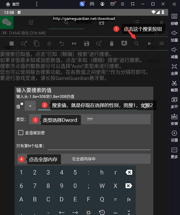 2. 打开GG和微信,在**微信-更多信息**这里点GG图标附加微信主进程,内存占用最大的那个就是