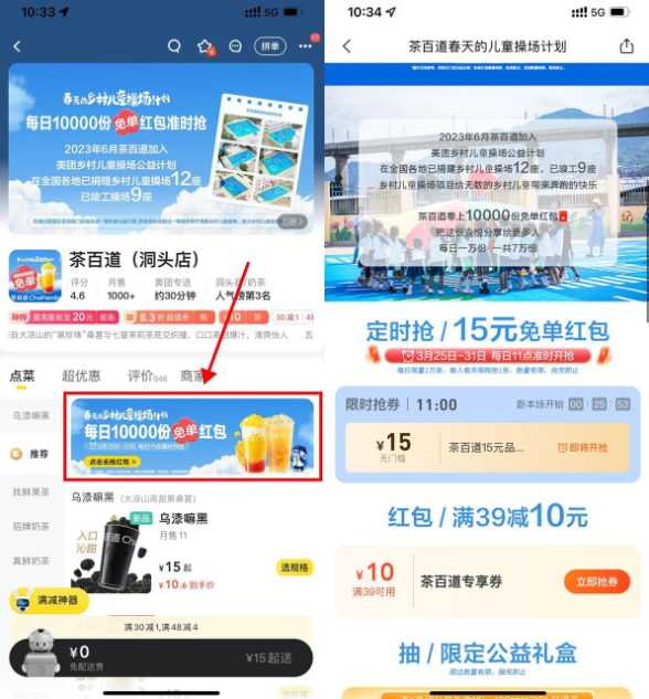 美团每天11点抢茶百道15元券