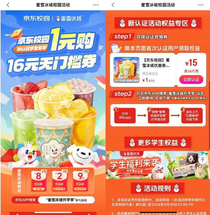 京东新学生领蜜雪冰城16亓券