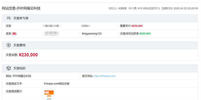 上图是今年的4月份,我们手里开叶网的一个出售记录,当时开叶网我记得是以5000元的价格买来的,优化不到一年的时间,最终以23万的价格卖出去了,实际到账22万。当时每天IP在1万多左右。PC权重4,移动权重6。
