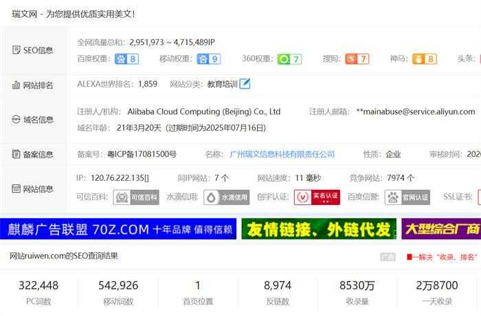 比如:瑞文网目前百度PC权重8,移动权重9,PC词库32万,移动词库54万,当然他们公司还有更多的类似瑞文网的网站,这里拿一个举例就可以了。