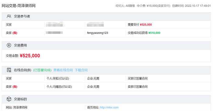 上图是我们律师网站的一个交易截图,律师网站我记得是3000元购买的,真实的优化时间大约只有几个月,实际上买网站有一年多时间了,但一直放在手里没有去动他,因为买来之前是个企业站,改版工程比较大,所以工作的优先级,我们给他排后面去了,大约优化半年多左右的时间,当时PC权重5,移动权重6,大约3.5万IP左右,售价52.5万,实际到账51万。