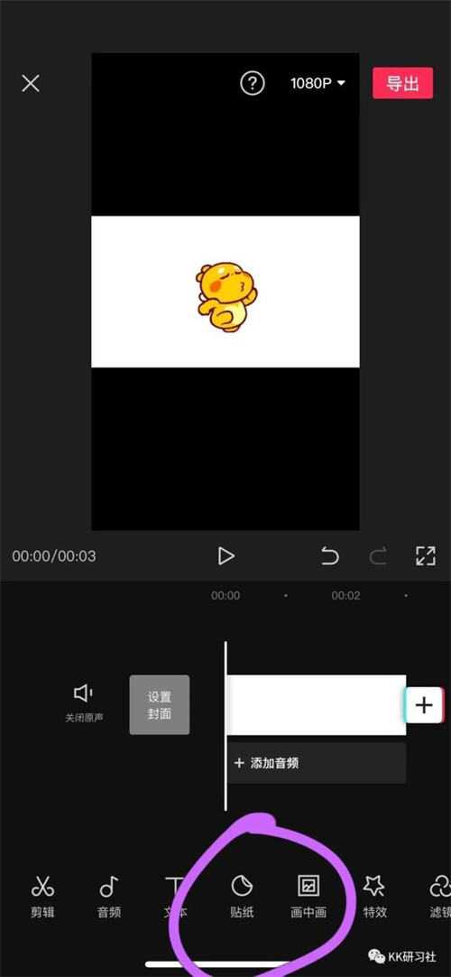 3.再次打开剪映,导入第二步那张图做成的视顿。然后我们找到贴纸这个功能,拉到最左,选择添加手机内图片,依次导入你选用的表情包素材。怕有朋友不知道点哪里,下面截图说明一下,加那个表情包,是用的贴纸形式,表情包怎么获取,我放到后面说。