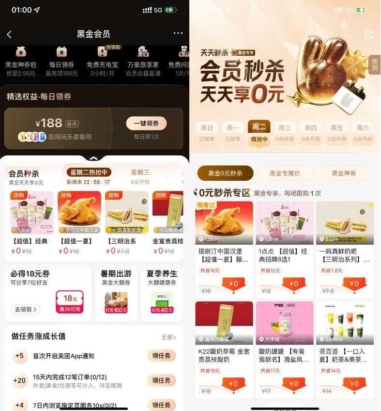 美团黑金以上会员天天0亓秒杀