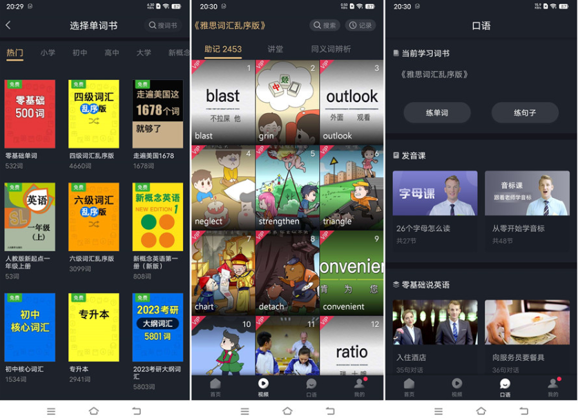 【告别机器人读音】软件采用真人视频发音,跟着美国人口型学习单词的读音,学习当下最标准最正宗的美式读音,并且拆解式是读法,让你听清每一个音节。