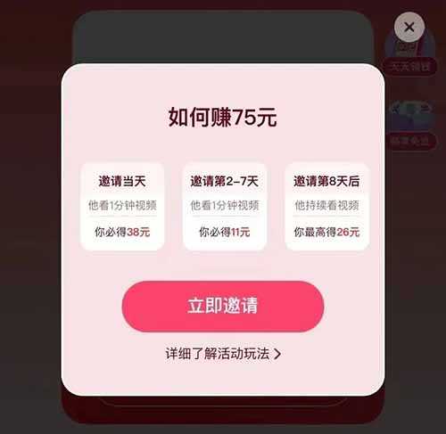例如:快手极速版,你只需要邀请一位新用户,就可以直接获得38元佣金,假设说要是这个新用户每天都去玩,我们最高就可以获得75元佣金。