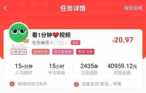 就好比下面这一位,他直接把快手极速版任务发布到以上这个兼职平台,然后设置好了门槛,就实现了躺赚。
