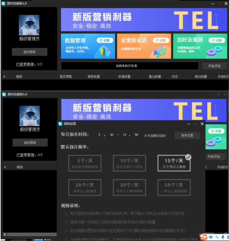微信多开、添加手机号/微信号/QQ好友、设置随机验证语、设置加好友时间段/频率