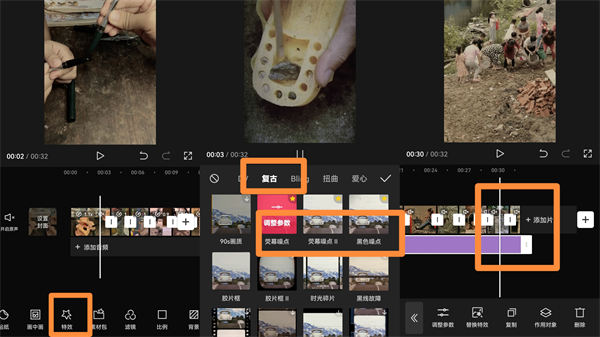 基本上复古特效,适合怀旧视频的,看了很多对标视频也是这个特效,所以我们一般会用到的特效是黑色噪点、荧幕噪点这两个,这个调完特效之后把特效拉到最后,和视频末尾对齐。
