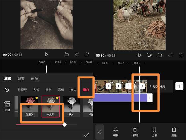 像我们做怀旧的滤镜,用的比较多的是黑白滤镜,黑白里分为牛皮纸、江浙沪等滤镜,这些都可以,可以根据自己的视频需求去选择,自己喜欢哪种就用哪种,调完滤镜之后,把滤镜一直往后拉,拉到和视频末尾对齐。