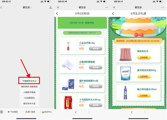 邮政会员日准点抢0元实物包邮